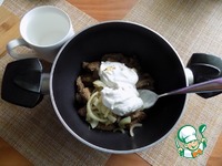 Лук отправляем к печени в кастрюлю, добавляем сметану и горячую воду. |