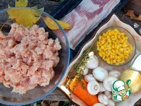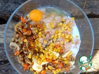 В фарш добавить сливки, сливочное масло, кукурузу, свежие листики тимьяна, обжаренные овощи, одно яйцо и специи. Все тщательно перемешать. |