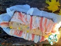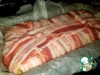 Прямоугольную форму застелить пергаментом, сверху внахлёст выложить полоски бекона так, чтобы края свисали, после чего, плотно выложить фарш с овощами и накрыть сверху свисающими краями бекона. |