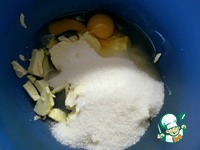 В отдельной миске взбить яйца, сахар и кусочки мягкого сливочного масла. |