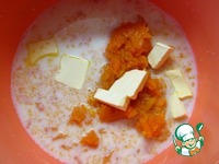 К теплому молоку добавить кусочки мягкого сливочного масла и тыквенное пюре. |
