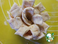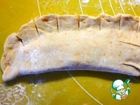 Раскатать кусочек теста в прямоугольник (примерно 25-28 см х 16-17 см). Положить начинку, сложить заготовку по длине пополам, накрыв тестом начинку. |