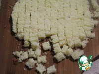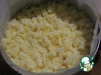 Вылить второй слой на остывший первый. Присыпать частью бисквитных кубиков, чтобы они прилипли. Отправить в холодильник на 2 часа. |