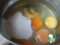 Яйца, сахар, мед, соль и ваниль смешать и поставить на водяную баню. Прогреть до 40 - 45 градусов, помешивая. |