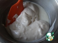 Небольшую часть взбитой массы смешать с молочно-творожной смесью (для дальнейшего ее равномерного распределения в основной массе и, чтобы долго не пришлось вымешивать и не нарушить пышность) |