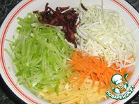 Сыр, редьку, морковь, капусту нарезать соломкой. |