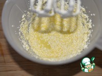 В третьей ёмкости взбиваем сливочное масло комнатной температуры в крем с сахаром с помощью миксера. |