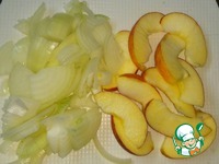 Лук нарезать четвертькольцами не слишком тонко. Яблоко помыть, удалить семена, нарезать дольками. |