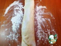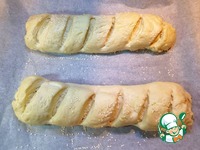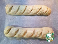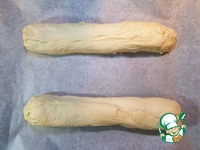 Полученный рулет разрезаем на 2 части. Руками формируем батоны, немного вытягивая тесто. |