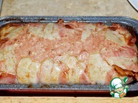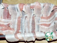 На бекон выкладываем половину куриного фарша, сверху кладем ровным слоем вымоченный чернослив. |