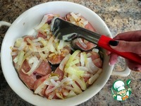 Пассеруем на сковороде луковицу порезаную четверть-кольцами. Выкладываем на стейки. |