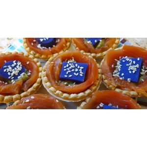 Описание: Корзиночки с гуакамоле, синим картофелем и красной рыбой. Эти корзиночки подойдут как для завтрака, так и для праздничного обеда/ужина.