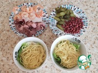 Собираем лапшу: закладываем огурчики, арахис, осминогов. |