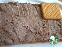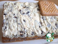 Далее творог с какао (этот шаг я пропустила), слой печенья и остатки творога с изюмом. Завершаем слоем печенья. |