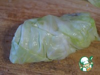 Грубые прожилки на капустных листьях отбить молоточком до мягкости. Фарш завернуть в листья формируя голубцы. |