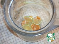 Один мандарин почистить, разделить на дольки и слегка подавить. Отправить в подготовленный графин, туда же порезать кружочками лимон (или лайм). |