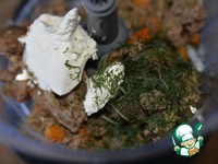 Кладём остывшую печень в чашу кухонного комбайна, добавляем творожный сыр и укроп (у меня замороженный). |