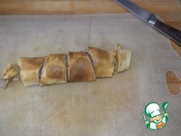 Отрезаем края рулета, они неровные и пустые. Острым ножом разрезаем рулет пополам и далее наискосок ещё пополам каждую часть. |