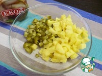 Нарезать кубиками вареный картофель и маринованные огурцы ТМ ЭКО. Сложить нарезку в миску. |