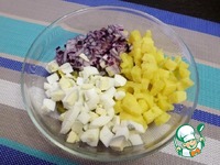 Вареное яйцо нарезать как картофель, а сладкий красный лук измельчить помельче. |
