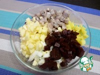 Соленую селедку и маринованную свеклу нарезать кубиками. Соединить нарезку в одной миске. |