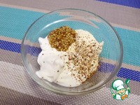 Приготовить заправку для салата из йогурта, майонеза и горчицы. Поперчить по вкусу и тщательно размешать. Кому покажется, что в салате будет мало соли, то добавьте её. Я не солила. |