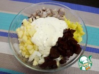 Залить нарезку приготовленной заправкой и аккуратно перемешать. |