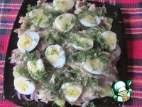 Равномерно поливаем салат заправкой и присыпаем мелко нарезанным укропом. |