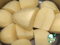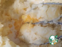 Далее снимаем кастрюлю с готовым картофелем с плиты, сливаем воду. Перекладываем картофель в миску и взбиваем с помощью миксера. Далее добавляем желток, сливочное масло, молоко и перемешиваем. |