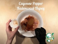 Приступаем к маринаду. К мясу добавляем соевый соус, в данном случае Терияки, паприку и кайенский перец. Хорошенько перемешиваем, накрываем пищевой пленкой и ставим в холодильний на 15-20 минут. |