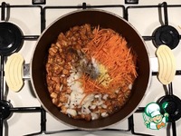 Когда мясо обжарится, добавляем к нему лук, морковь, универсальную приправу, чёрный перец и сахар. Продолжаем обжаривать |