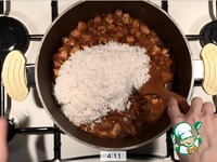Когда мясо и овощи будут готовы, сливаем воду с риса и добавляем рис в кастрюлю. Хорошо все перемешиваем. |