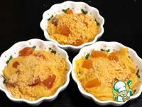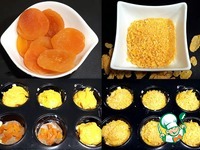 Теста немного осталось, и я положила его в три намазанные маслом фаянсовые формочки. На дно которых положила кружочки из пергамента. Сверху на тесто положила нарезанную курагу и посыпала хлопьями. |