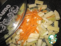 Добавить к луку стручковую фасоль, кабачок, нарезанный брусочками и морковь, нарезанную соломкой. Обжарить в течение 5 минут. |