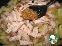 Варено-копченую грудку нарезать на небольшие брусочки, переложить в сковороду. Добавить смесь ароматных трав, свежемолотый перец, закрыть крышкой и тушить 3-4 минуты. |