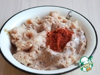 Соединить в миске фарш и хлебную массу, добавить смесь пряностей по вкусу, добавить соль и черный молотый перец. |