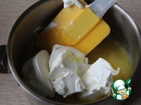 Масло растопить, добавить сливочный творожный сыр (можно обычный жирный творог использовать), соль и специи. |