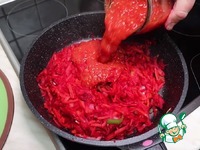 4. Зажарка. Последовательно обжариваем овощи: лук, морковь, свеклу, болгарский перец. И добавляем в зажарку томат. Самое важное выровнять вкус по соли и сахару. |
