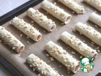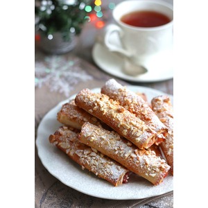 Трубочки смазать взбитым яйцом посыпать измельченным и обжаренным миндалем. Отправить пекарский лист в разогретую до t180-190С духовку и заколеровать до нужного вам цвета. |