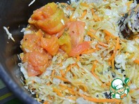 На растительном масле обжарить кольца лука, выложить капусту. Жарить 10 минут, помешивая, огонь ниже среднего. |
