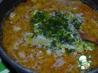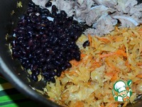 Фасоль слить, выложить к капусте, добавить кусочки варёного мяса. Залить 3 -3,5 л. бульона, посолить. |