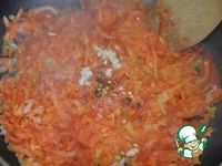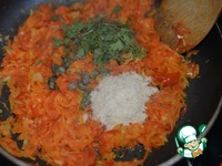 Добавляем порезанный перец, кладём соль, сахар, хлопья перца чили, выдавливаем чеснок, перемешиваем. Тушим на среднем огне около 5 минут. |