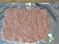 Берём фольгу, складываем вдвое, кладём сверху слой фарша толщиной около 1,5-2 см, разравниваем в прямоугольник. |
