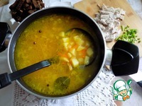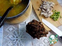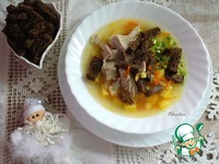 Разливаем суп по тарелкам, выкладываем мясо и зелёный лук. Подаём к нему сухарики. |