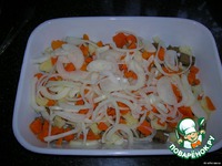 Лук - полукольцами и сверху овощей. |