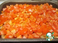 Нарезаем кубиками помидоры, выкладываем поверх овощей, наливаем в форму вино и бульон. Добавляем специи. Ставим в духовку на 1,5 часа до выпаривания жидкости. |