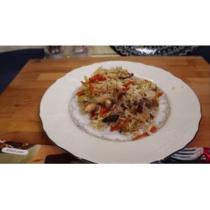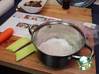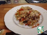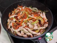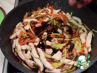 5. Обжариваем морковь на сковородке 2-3 мин, следом на сковородку отправляем индейку, лук-порей и грибы. Солим и перчим по вкусу. |
