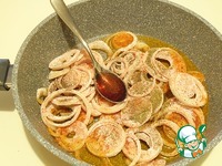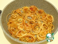 А вместо них выложить, в остатки масла на сковороде, панированный лук, посыпать всеми специями, полить уксусом, чуть перемешать и быстро обжарить с одной стороны. |