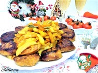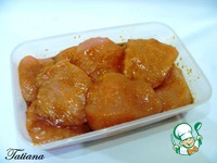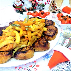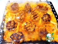 Рукав закрепите, слегка встряхните, чтобы овощи перемешались между собой и со специями. Положите рукав на противень, отставьте в сторону (в духовку пока не ставьте). Включите духовку. Замаринованные медальоны из индейки обжарьте на разогретой сковороде-гриль по 2-3 минуты с двух сторон, медальоны слегка посолите (0,5 ч. л.), поперчите. Рукав с овощами откройте в одной стороны, разложите обжаренные индюшиные медальоны поверх овощей, рукав снова закрепите. Рукав не прокалывайте (при таком способе приготовления, мясо индейки останется сочным и мягким, да и овощи приготовятся гораздо быстрее).