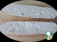 Половинки багета смазываем майонезно-сметанной смесью. Одну половинку, нижнюю, присыпаем тертым сыром так, чтобы сыр попал и на края. |